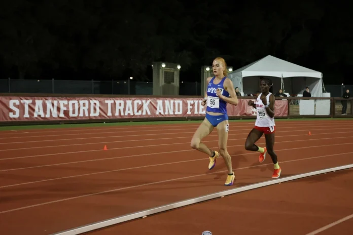 Jane Hedengren, BYU, en route to an NCAA record 10,000m time of 30:46.80 at the Stanford Invitational, April 3, 2026. Photo by BYU Track & Field