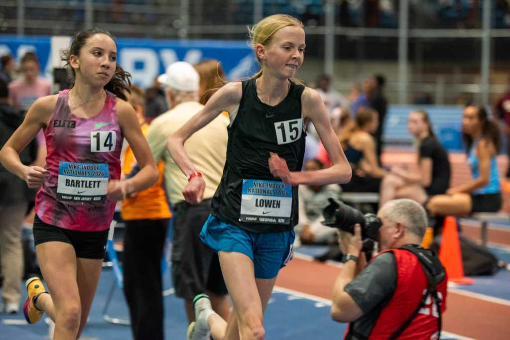 Avery Lowen and Blair Bartlett open the first night of NIN 2026 at 5,000 meters, photo by @CameraAthletica for RunBlogRun.