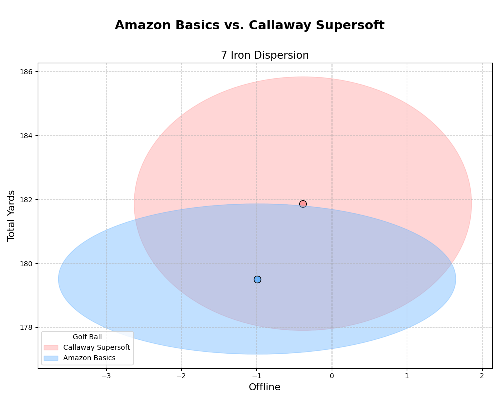 Given the cuckoo ball that was observed with the Amazon Basics driver sample, the larger (though not as much as the chart scale suggests) wedge distribution pattern, and the slight distance advantage across the board, I’m inclined to say that Callaway Supersoft performed slightly better.