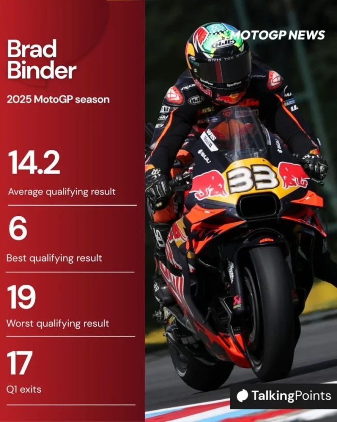 The British Grand Prix and Czech Grand Prix saw Binder produce his worst qualifying results in 2025, packing P19 at Silverstone and Brno. He also qualified P18 in Qatar, Japan and Malaysia, while KTM’s top rider was P6 (Maverick Vinales), P4 (Acosta) and P5 (Acosta).