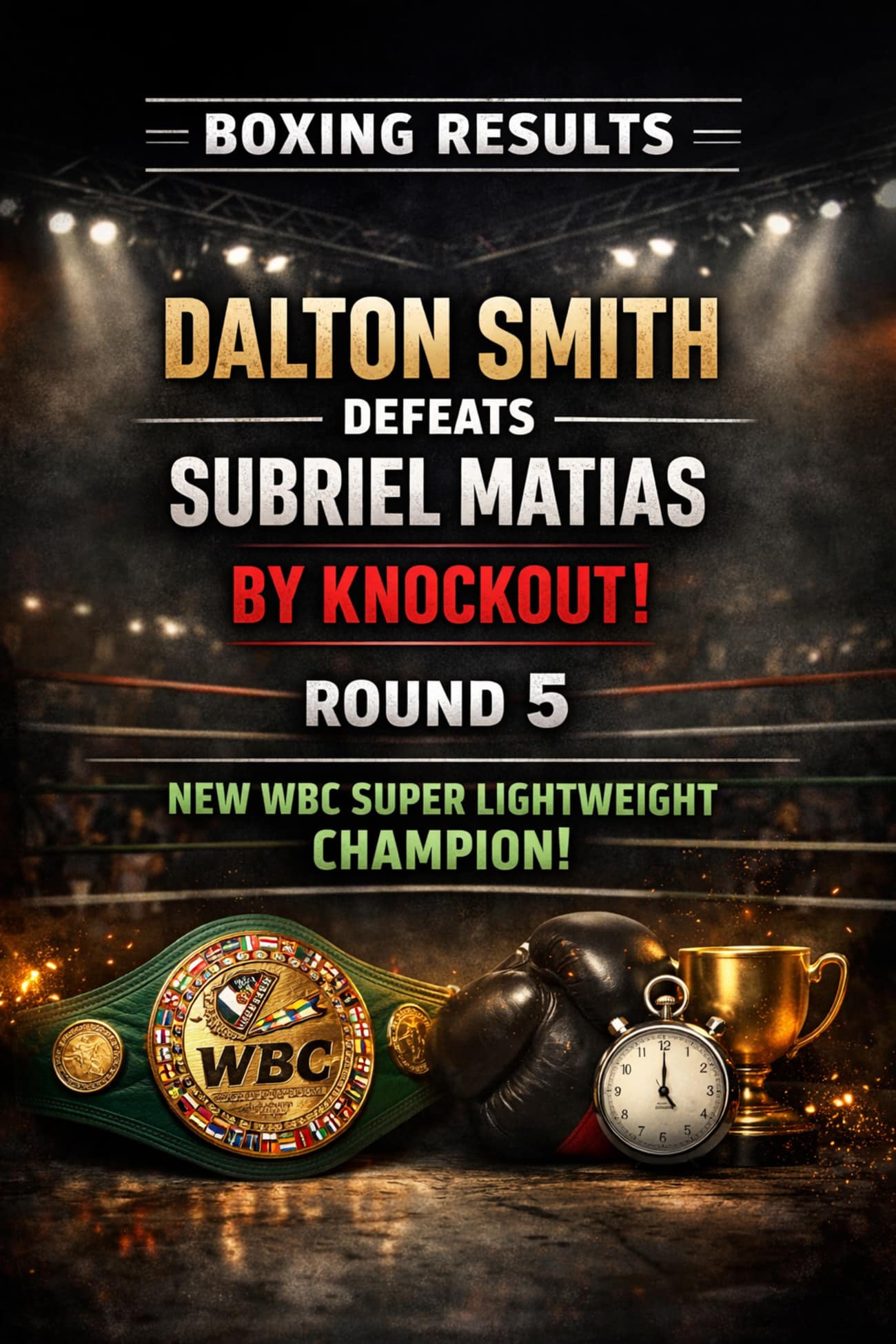 In the fifth round, Smith landed a sharp right hand that dropped Matias. The champion stood up, but his balance was gone. A second right followed. This time Matias stayed. The battle ended there, suddenly and decisively.