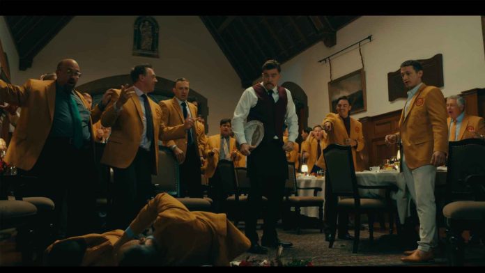 Most of those players make their entry during a dinner scene for the winners of the Tour championship. It is there that Adam Sandler sits with Jack Nicklaus, Nick Faldo, Fred Couple and Lee Trevino, while Jordan Spieth complains about the brand of jeans in his drink and Xander Schauffle tries to laugh at a joke “this is what she said.”