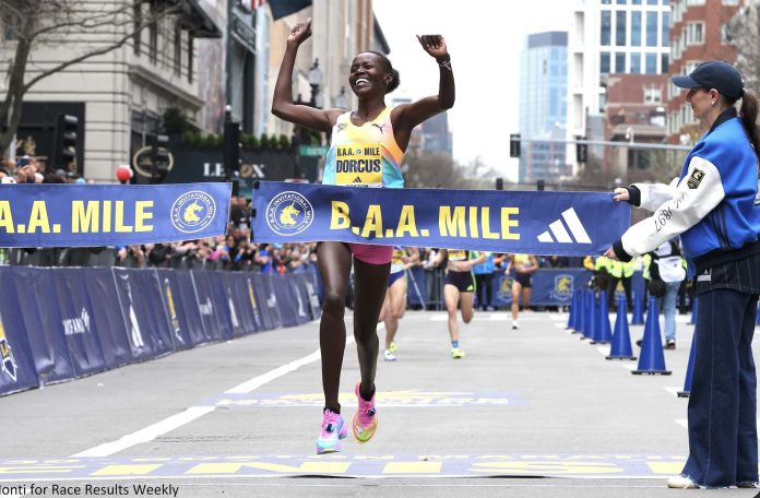BOSTON (18-Apr) — Dorcas Evoy, Kenya’s silver medalist in the 1500m at last summer’s World Athletics Championships in Tokyo, repeated as the BAA Invitational Mile champion today, setting a new course record of 4:29.8. The 29-year-old Evoy, who competes for the Puma Elite Running team in North Carolina, dominated the three-lap race, leading from the gun and pulling ahead with each subsequent lap. He won a cash prize of $3,000.