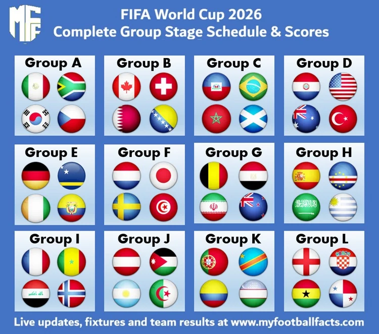 Keep up to date with the complete FIFA World Cup 2026 schedule below. Our guide includes all group stage matches, kick-off times and direct links to live scores and individual team results for each match in the tournament.