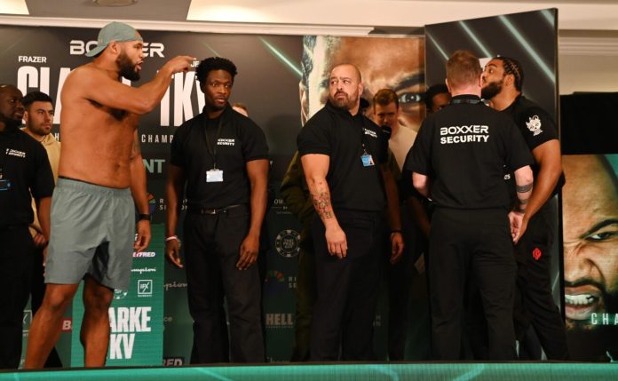 Tempers flared in Derby as Frazer Clarke and Jeamie TKV nearly tore through security during a fierce weigh-in that set the tone for tomorrow night’s British Heavyweight title fight. Both men locked in at career-heavy weights – Clarke at 270.2 lbsTKV at 264.9 lbs – and neither of them bothered to pretend to like each other. BBC Two’s cameras caught the pushing, the shouting and the security scramble. That alone will drag many casuals into the broadcast.