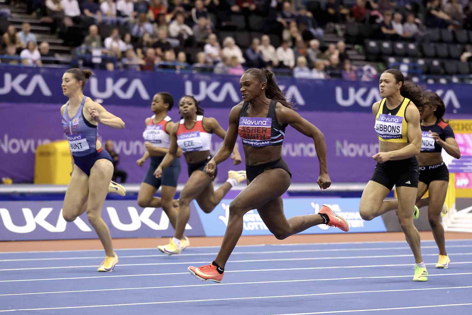 The first event of the program Novuna Great Britain Indoor Athletics Championships 60m premiered, women and men. It was the first of three races of the day, preparing the athletes for the Los Angeles schedule. The main thrill among the men was to see Jeremiah AzuEuropean and world indoor championships champion in action. The women’s race was Dina Usher-Smith’s first appearance for several years. Dina was the fastest in the preliminary stage: 7.17; in the semi-final Dina 7.11 was again fastest and Amy Hunt second fastest (in individual semis) at 7.2. The final is over.