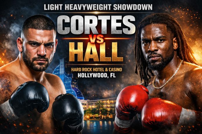 Cortes returns to action in an eight-round light heavyweight contest against Hall, a bout that figures to provide solid rounds and a competitive test.