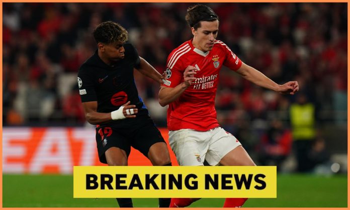 Alvaro Carreras in action for Benfica against Barcelona (photo of Gualter Fatia/Getty Images)