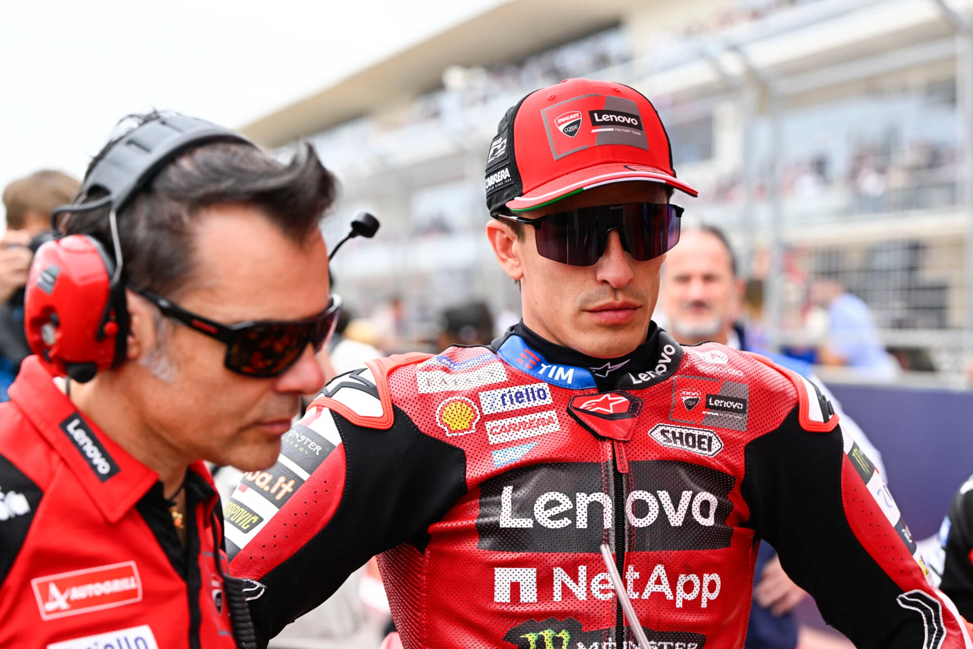 Spanish rider Marc Marquez of the Ducati Lenovo Team is seen before the start of the sprint race at the MotoGP Red Bull Grand Prix of the United States at the Circuit of the Americas in Austin, United States, March 28, 2026.