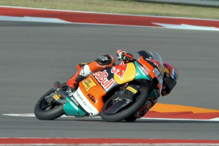 Alvaro Carpe during Moto3 World Championship Free Practice One (FP1) on Friday morning at Circuit of the Americas in Texas. Riding a Red Bull KTM Ajo machine on Pirelli Control tires, the Spaniard covered the 3.43-mile (5.51 km) road course in 2:14.209 to lead a field of 25 riders.