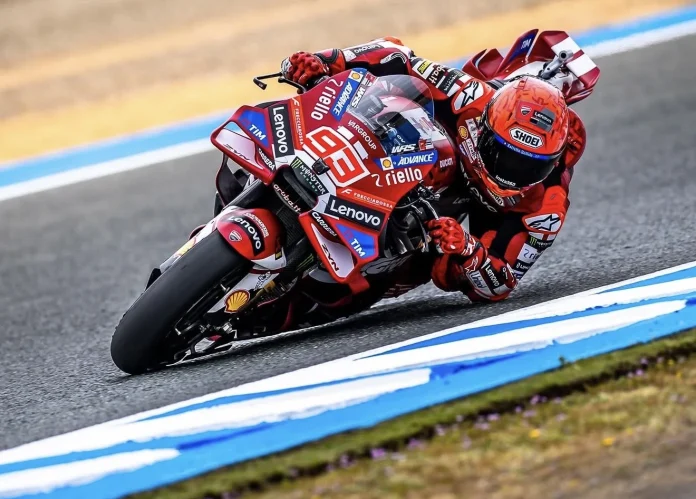 Marc Marquez mastered difficult conditions to secure pole position in MotoGP qualifying Saturday at the Cercio de Jerez – Ángel Nieto, Spain. Riding his Lenovo Team Ducati Desmosedici GP26 on the 2.75-mile (4.42 km) track, Marquez set a 1:48.087 in the 23-rider field.