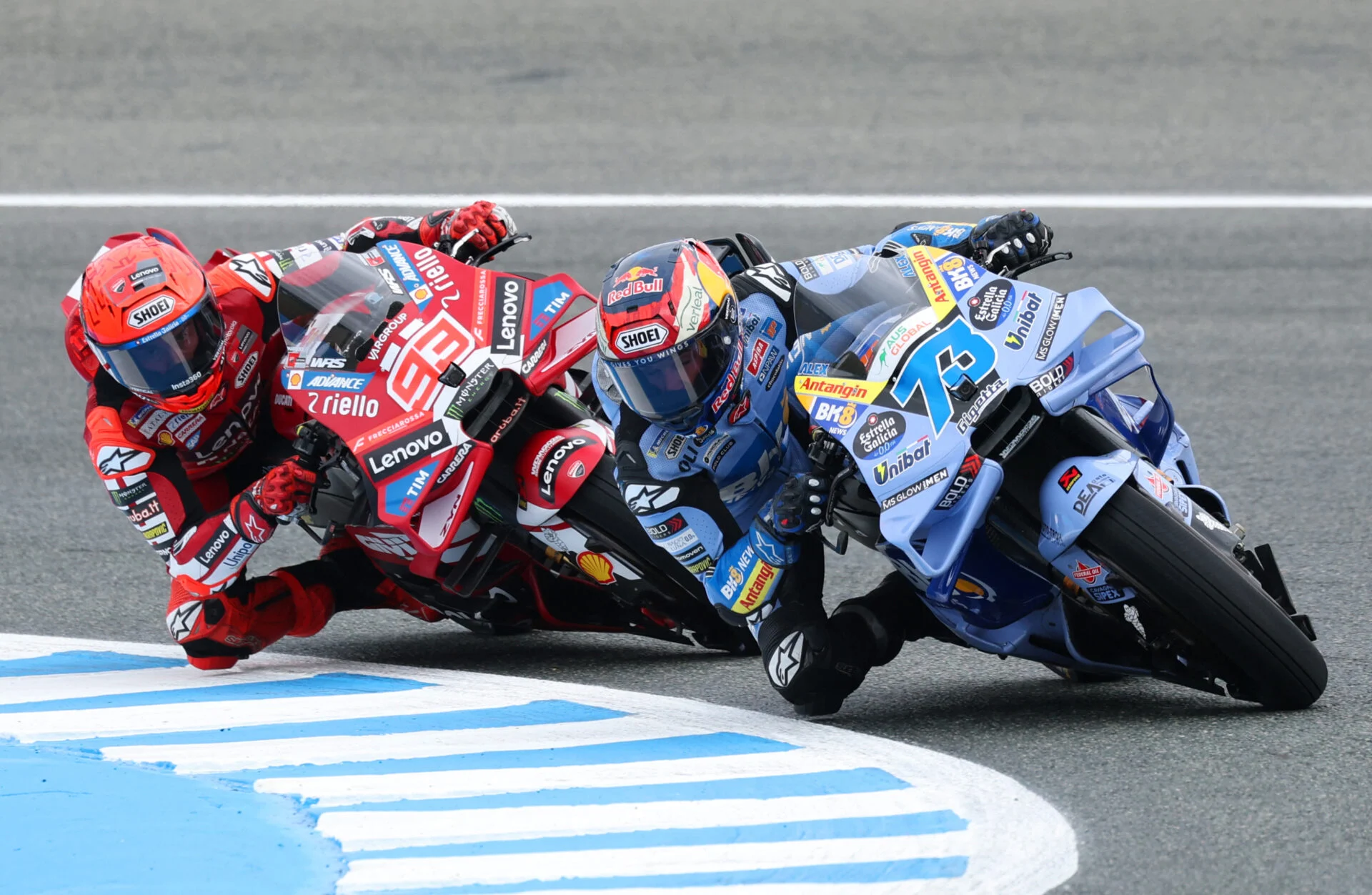 Alex Marquez of Team Gresini Racing MotoGP rides ahead of Marc Marquez (L) of Team Ducati of Team Lenovo during the MotoGP Spanish Grand Prix race in Jerez on April 25, 2026.