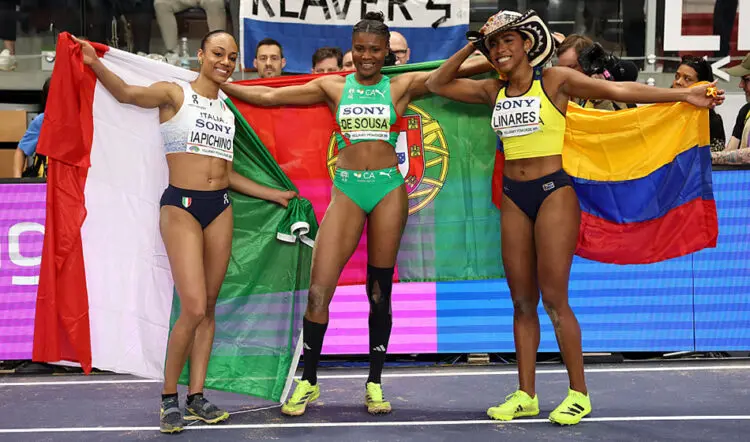 Italy’s Larissa Iapicchino, former English Schools champion and daughter of 1997 world indoor champion Fiona May, finished runner-up with 6.87m to win her first world senior medal.