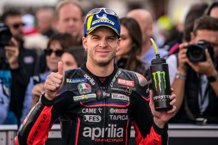 Aprilia rider Marco Bezecchi celebrates after taking pole position for the 2025 Valencia Grand Prix.