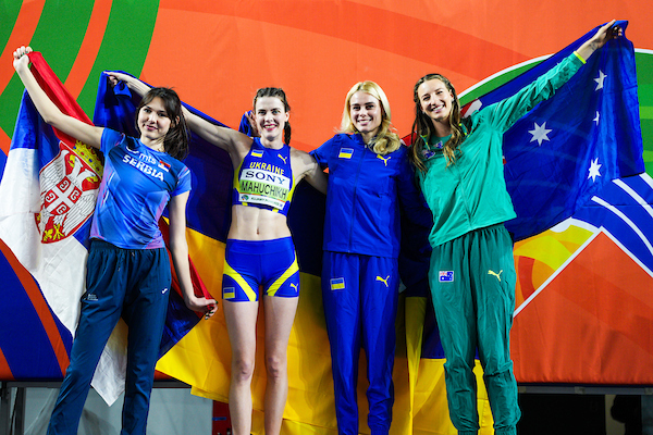 Angelina Topic, Jaroslava Mahucich, Yuliva Levchenko and Nikola Olislagers, Toruń 2026 HJ medalists, photo by World Athletics