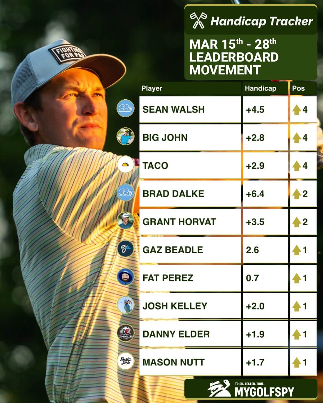 Here’s the latest update with some notable moves from Sean Walsh, Brad Dalke, Gaz Beadle and Fat Perez. The data comes from the handicap tracker which monitors scores from golf videos on YouTube and calculates handicaps based on those rounds.